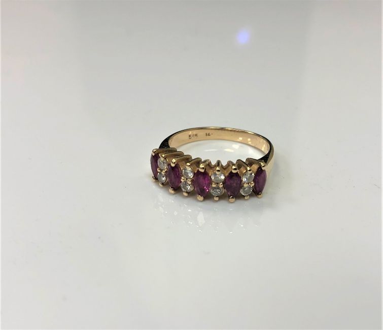 A 14ct gold five stone diamond and ruby ring, 2.9g, size K.