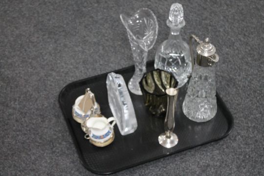 A tray of glass ware, decanter, claret jug, Norwegian lead crystal paperweight depicting a Moose, Paragon milk jug on plated stand