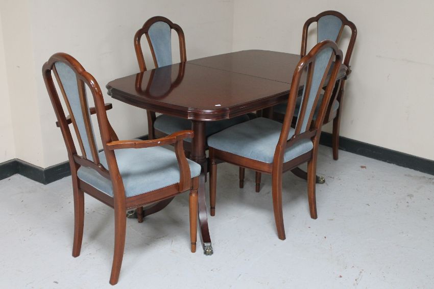 An inlaid mahogany shaped extending dining table fitted with a leaf and four chairs