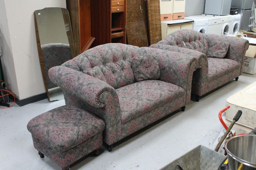 A pair of Victorian style two seater settees with cushions upholstered in classical floral fabric with footstool