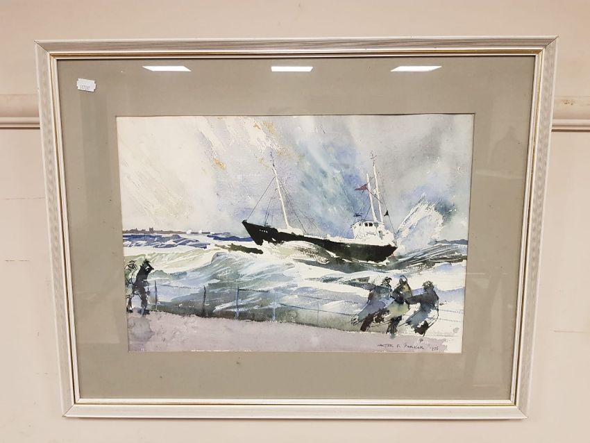 Walter F Parker : Study of a lake, watercolour, signed and dated 1986, 48 cm x 38 cm together with another by the same artist depicting a boat in rough seas. (2)
