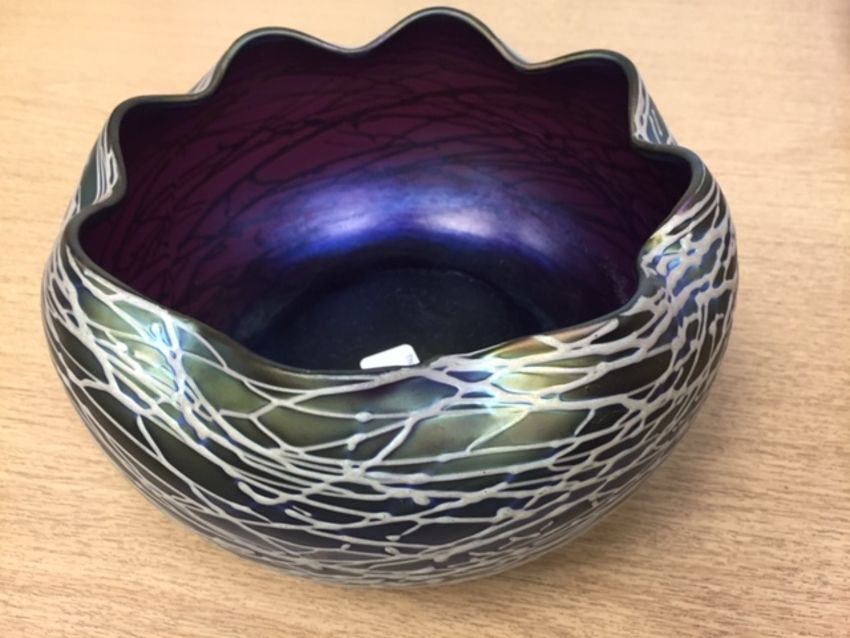 An iridescent Austrian amethyst glass bowl in the manner of Loetz, width 20cm