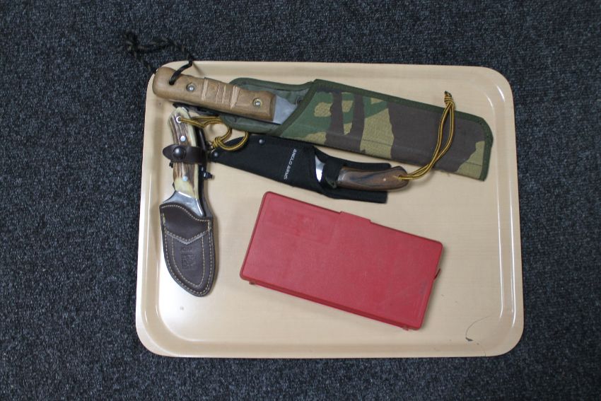 A tray of machete in sheath, two hunting knives together with an Lanksy cased sharpener