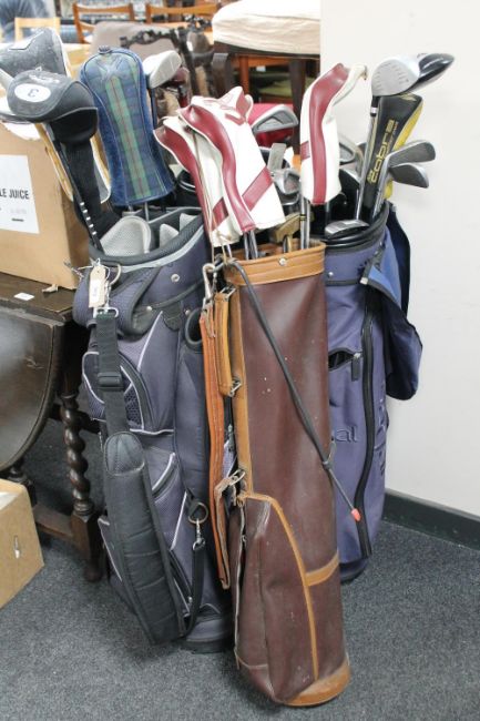 Four golf bags containing assorted irons and drivers
