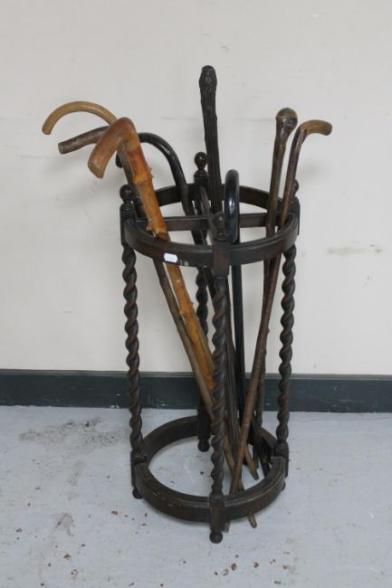An antique oak barley twist stick stand (no tray) together with seven antique and later walking sticks