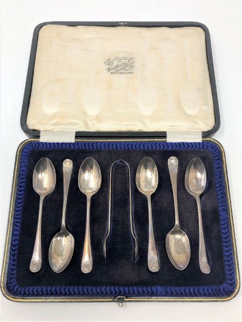 A cased set of six silver teaspoons with tongs, Sheffield marks