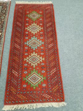 A Caucasian design rug on red ground 203 cm x 84 cm