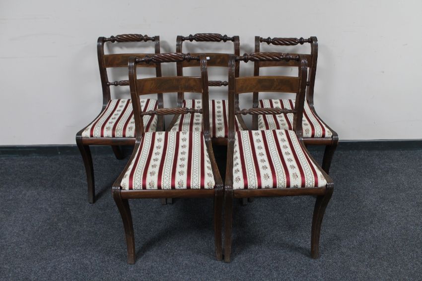 Five antique mahogany dining chairs upholstered in Regency stripe fabric