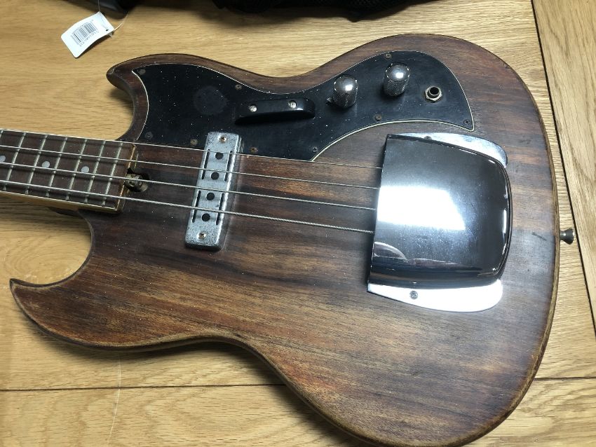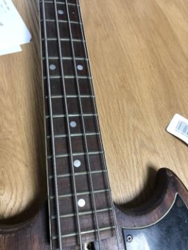 Flecks of white paint all over. Metal pieces are corroded. Screws in pickguard are rusted. Loss of inlay to right side of neck. See additional images.