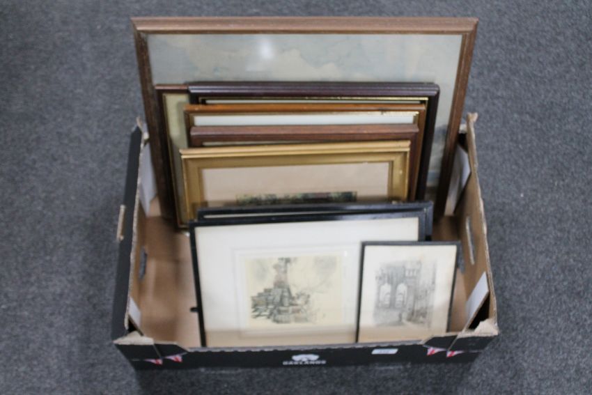 A box containing antiquarian and later signed etchings, framed watercolours, prints etc