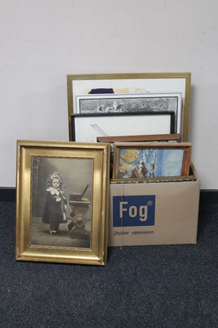 A box of continental school pictures and prints and gallery posters