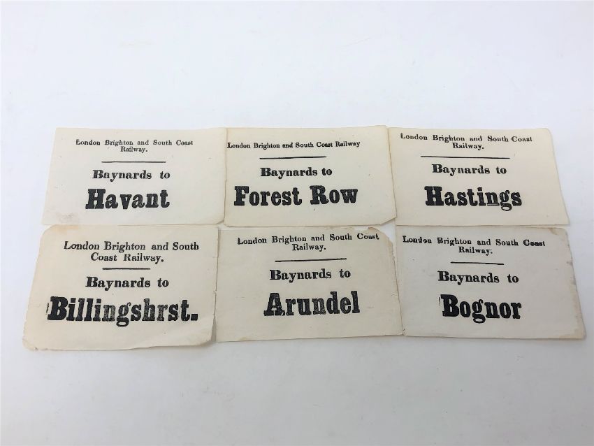 Six Victorian train tickets for the London, Brighton and South Coast Railway