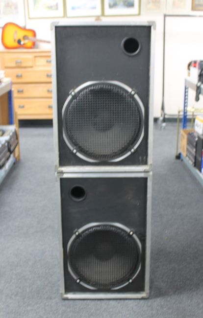 A pair of aluminium P.A. speakers
