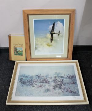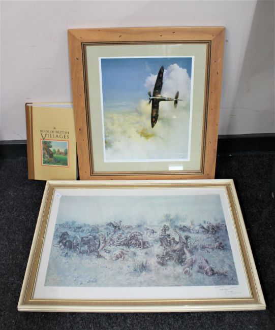 A framed Terrence Cuneo signed limited edition print, number 15/25 depicting a battle scene, a framed print of a spitfire number 248/1000 signed David and one volume AA book of British villages