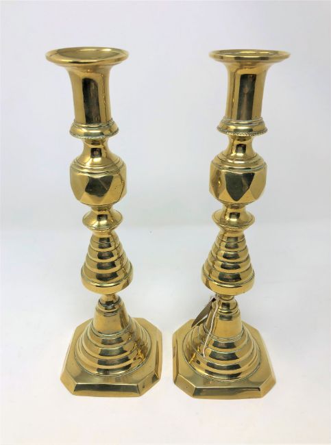 A pair of Victorian brass 'King of Diamonds' brass candlesticks with rise-motion bases, height 29 cm. (2)