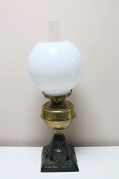 An antique brass oil lamp with glass chimney and shade on cast iron base