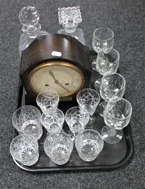 A tray of Bentima mantel clock, two crystal decanters and various glasses