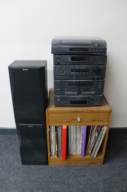 A Sony hifi system with speakers and remote on teak effect stand containing LP records and tapes