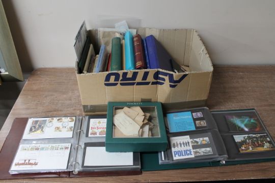 A box of loose stamps, stamp albums and stamps, albums of first day covers