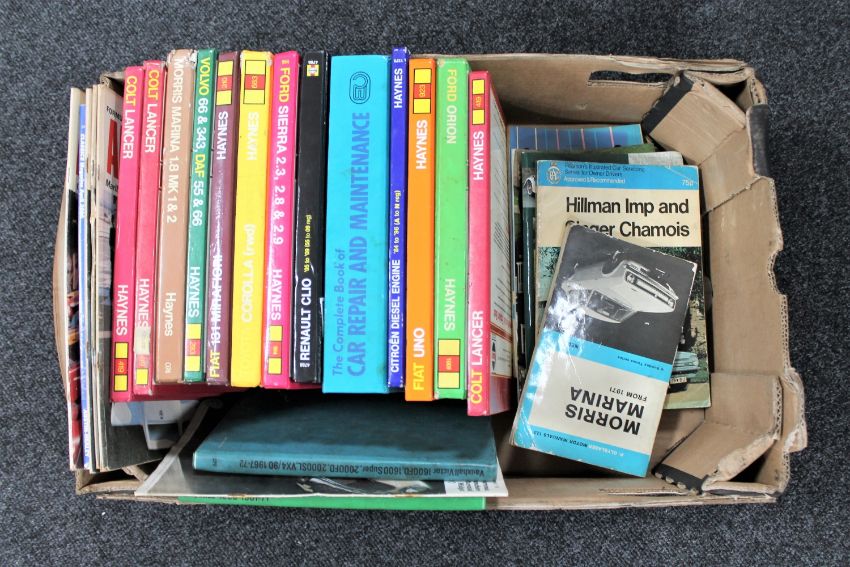A box of Haynes car manuals together with car manuals, Morris Marina, Hillman Imp