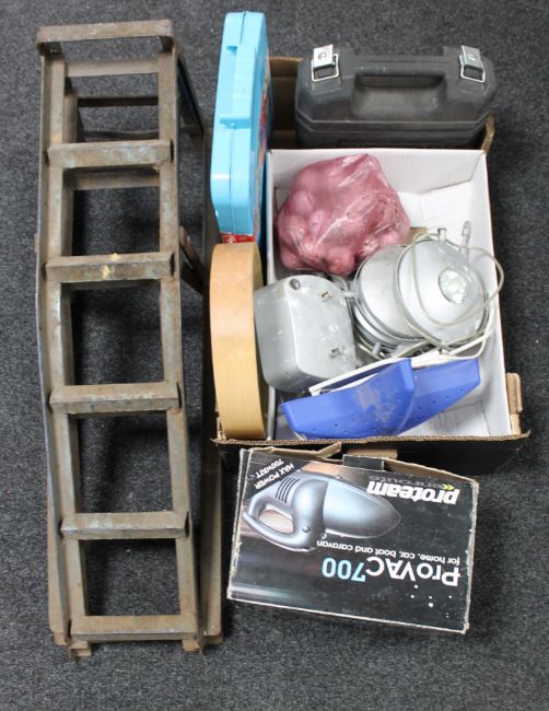 A box of light fittings, wall clock, Workzone drill, Pro-vac and pair of car ramps