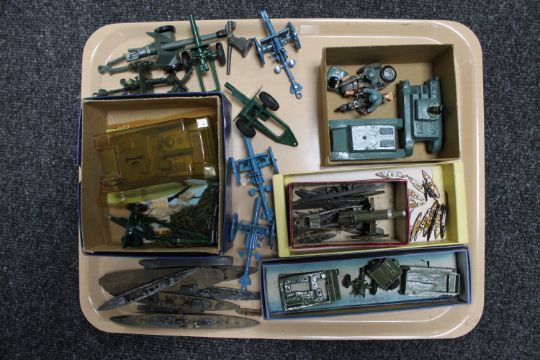 A tray of mid twentieth century die-cast artillery guns, battle cruisers , 18lb quick fire gun etc