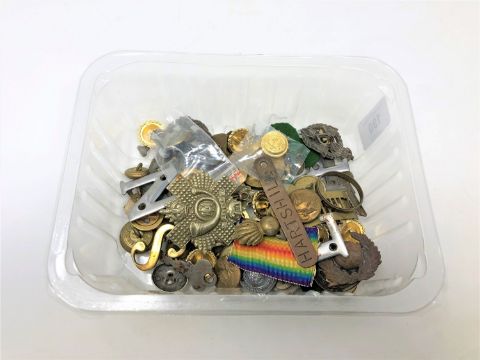 A collection of military buttons and cap badges etc