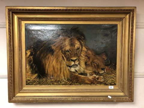 20th Century school : Lion with cub, oil on canvas, 74 cm x 50 cm, framed.