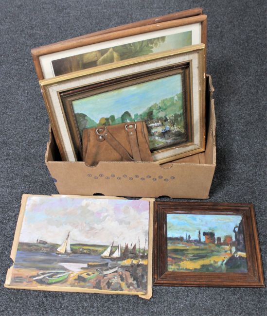 A box of pair of Polynesian framed prints together with four oils on board depicting boats on water, industrial scene together with a leather bag
