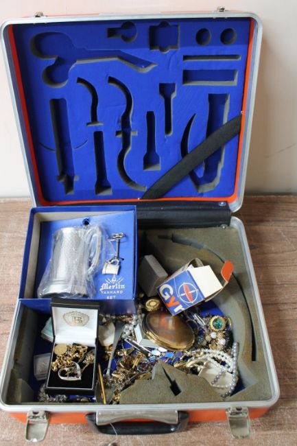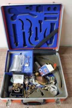 A plastic case containing a quantity of costume jewellery, compact, tankard etc
