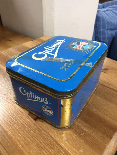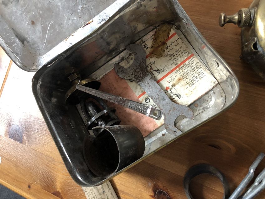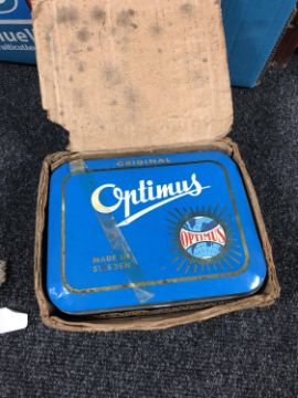 A box of two military first aid kits, pair of leather chaps, boxed Optimus stove, metal tool box etc