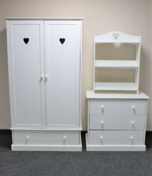A contemporary white double door wardrobe fitted a drawer with matching three drawer chest and open bookshelves