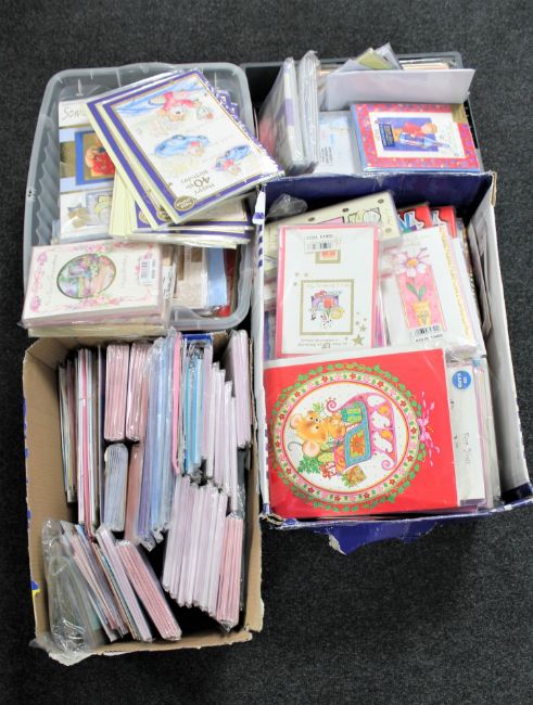 Four boxes containing a large quantity of greetings cards