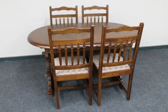 An oval extending dining table and four chairs