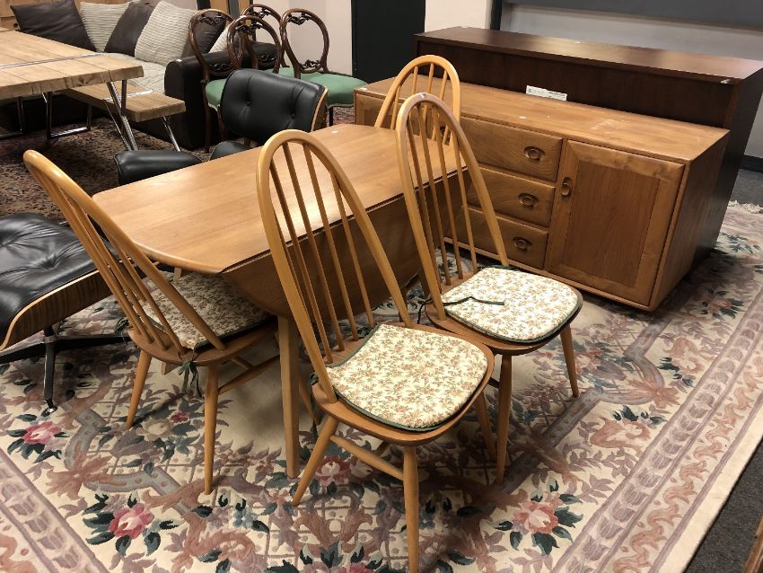 An Ercol Golden Dawn six piece dining room suite : long low sideboard, width 156 cm, flap sided table and four chairs