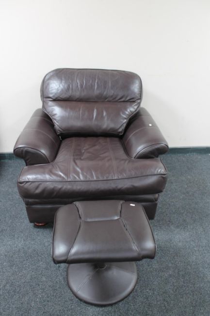 A brown leather armchair and footstool