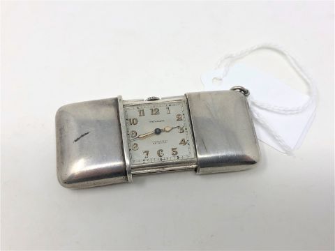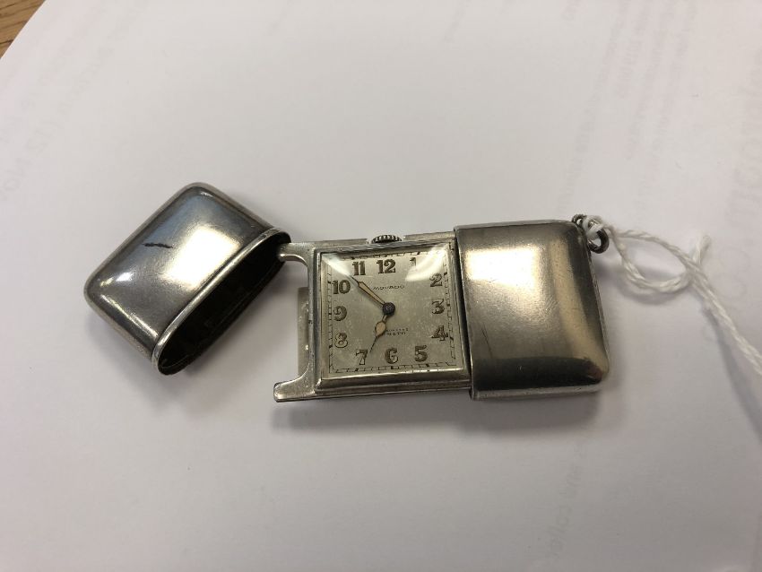 The watch does not wind and is not currently running. The time can be adjusted when the crown is pulled. The crown appears to be the only winding mechanism. One side of the external silver case can be removed but the other side is much more securely attached and I do not wish to force it. The silvered dial has typical flecks of dirt and wear to the Arabic numerals. The case is stamped 925 in numerous places and also marked Fab Suisse.