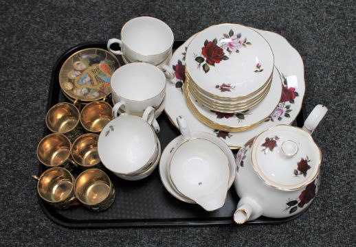 A tray of twenty-one piece Colclough rose patterned tea service together with six Japanese lustre coffee cans with saucers