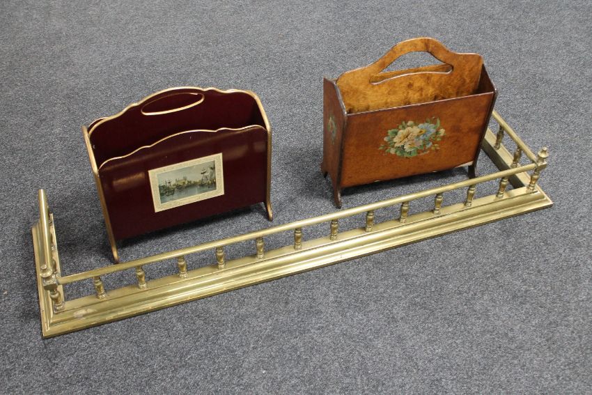 An antique brass fire curb and two 20th century magazine racks