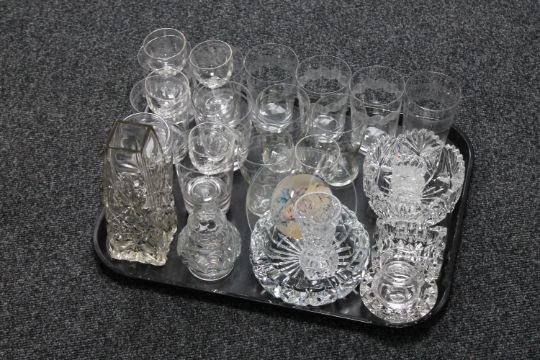 A tray of antique and later glass ware : glasses, vases, ash tray etc