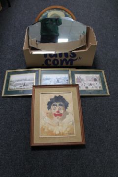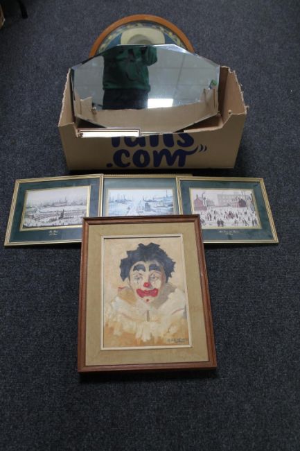A box of oil on canvas of a clown, framed L.S. Lowry print, religious print etc