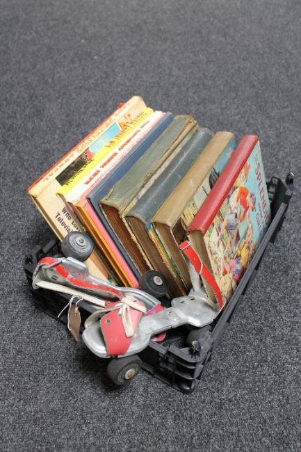 A crate of a pair of vintage roller skates, annual including Bunty for Girls, The Modern Book for Boys etc