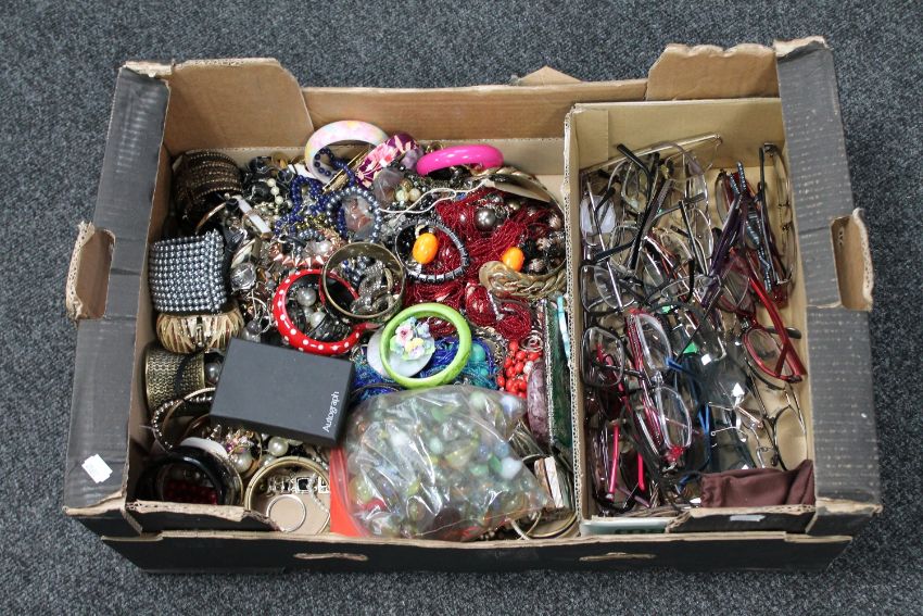 A box of a bag of marbles, assorted costume jewellery, watches, assorted reading glasses