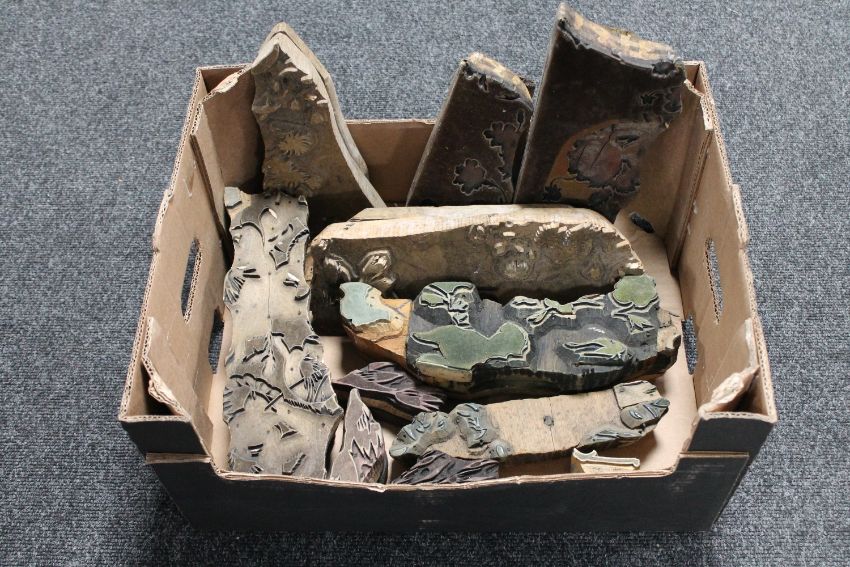 A collection of nine antique wooden printing blocks purportedly late 19th early 20th century from Stead McAlpin. Stead McAlpin were commissioned by Stern & Walther, agents for White Star line Shipping Line to produce exclusive fabric for the Titanic's Saloon.