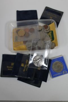 A box of 20th century American coins, Elizabeth II £2 coin, £5 coin, 1981 Royal Wedding crown, Victorian South Africa medal (naming rubbed) etc