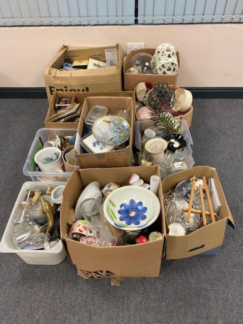 A pallet of ten boxes of assorted bric a brac, glass ware, china, planters etc