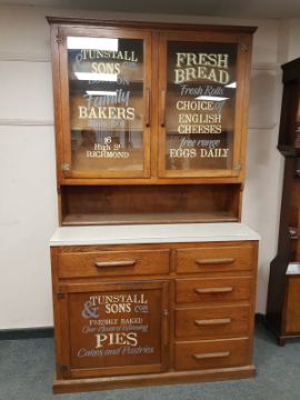 An early 20th century oak kitchen cabinet with later advertising decorations, width 123 cm