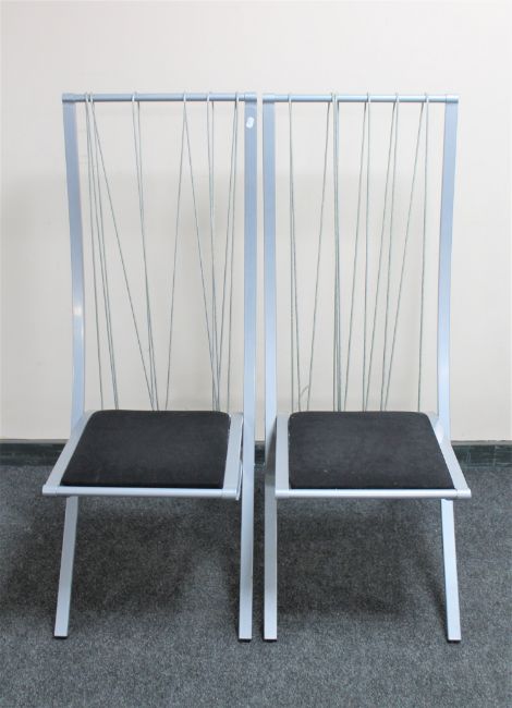 A pair of metal framed wire back dining chairs