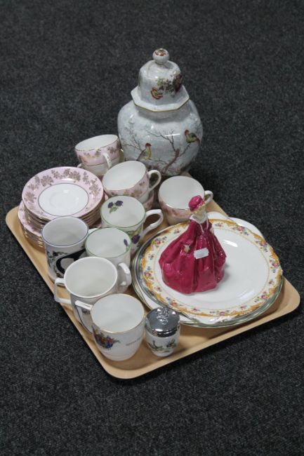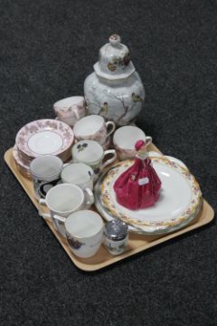 A tray of Royal Worcester Grandmother's Dress figure, serving plates, mugs, part tea service etc