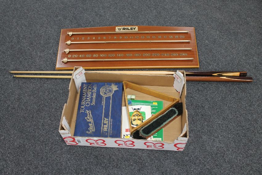 A Riley snooker score board, a box of Riley Steve Davis tournament championship snooker balls, Riley triangle, two cues (one Riley) and further snooker accessories